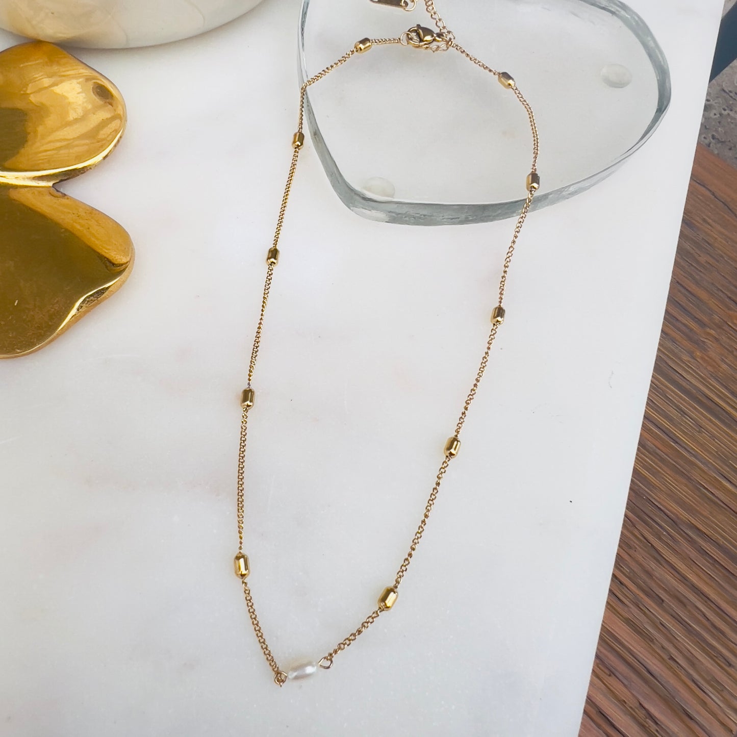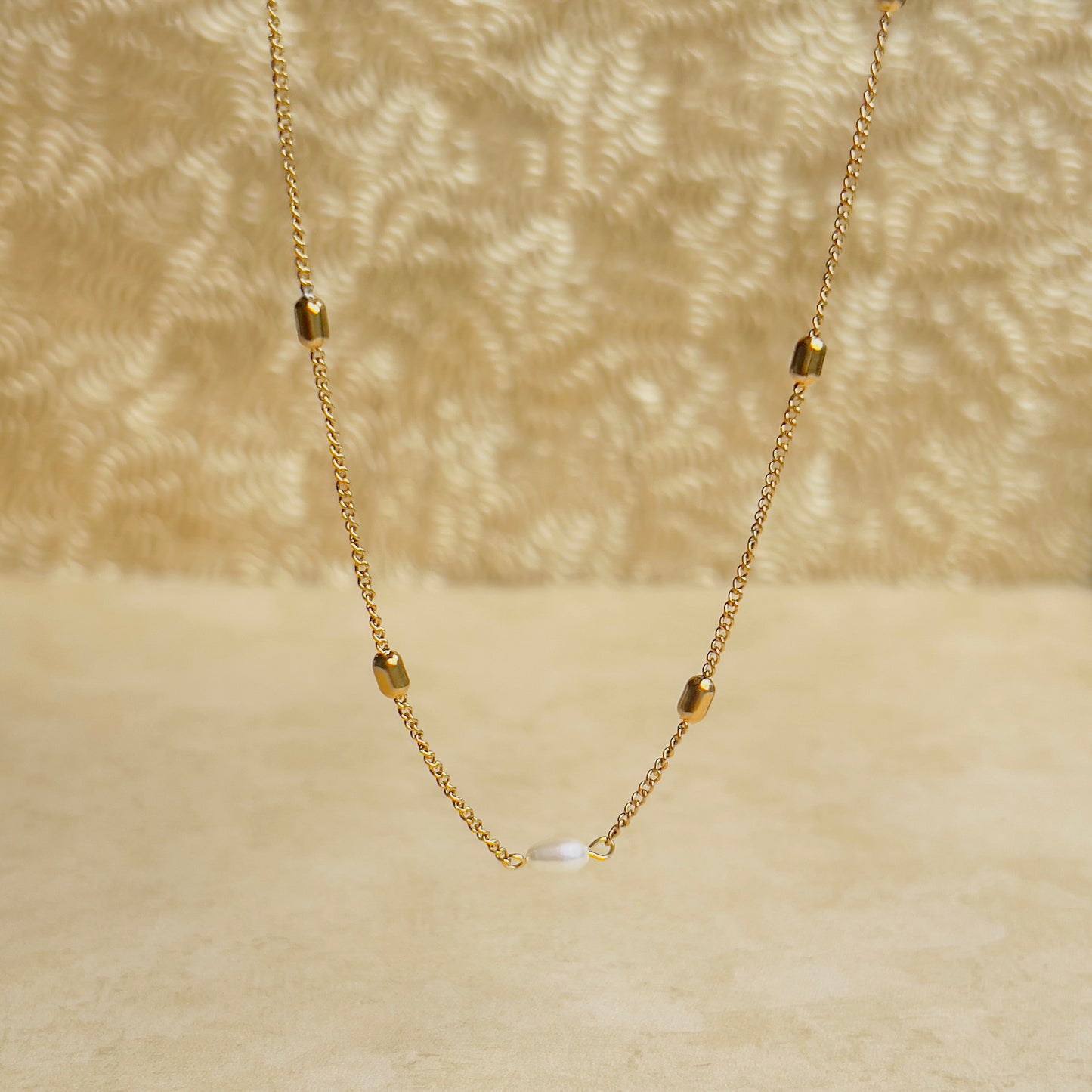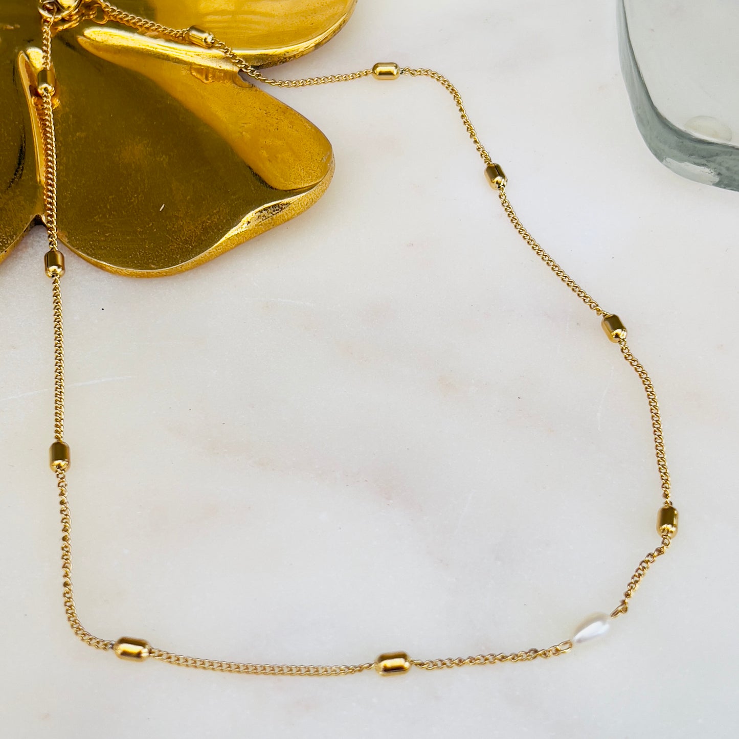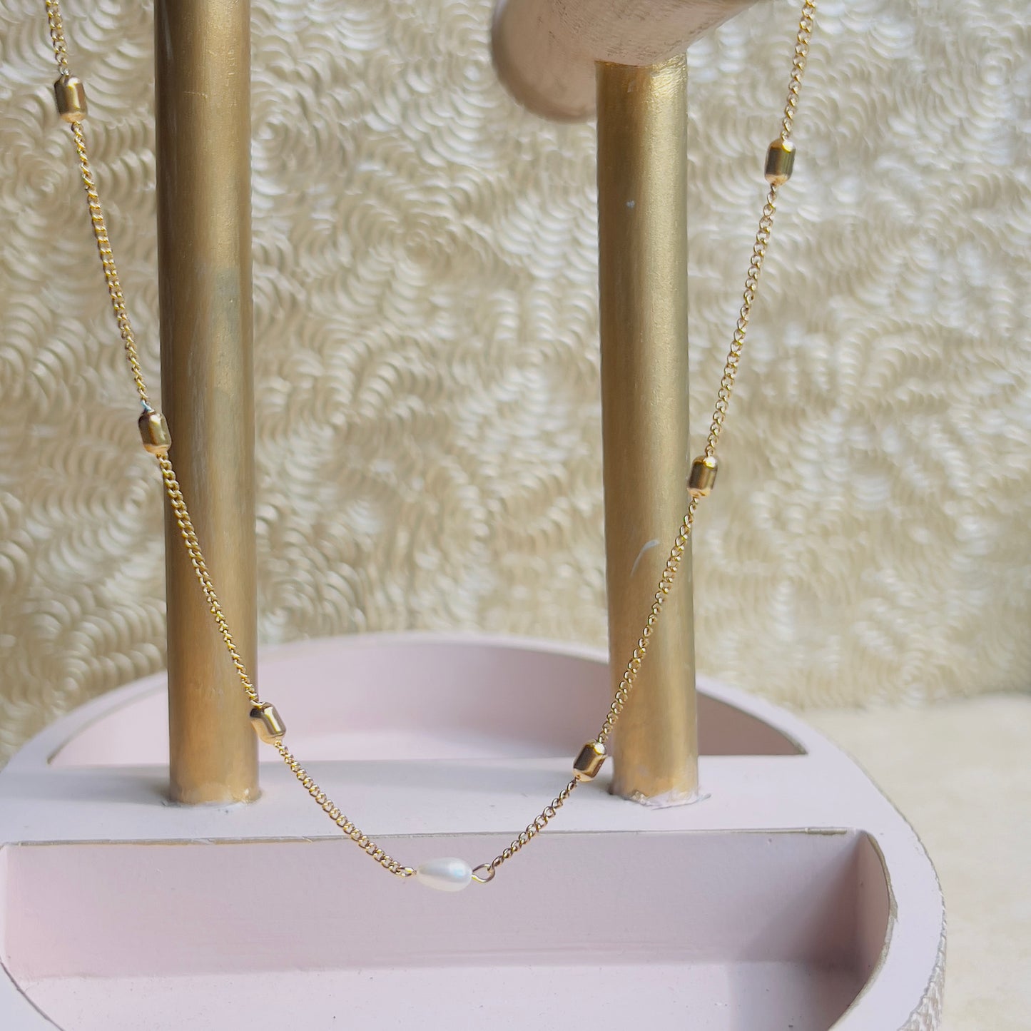 Delicate layered necklace featuring a fine gold-plated chain accented with subtle bead details and a central gemstone pendant. A perfect balance between simplicity and elegance, ideal for elevating both casual and formal looks.