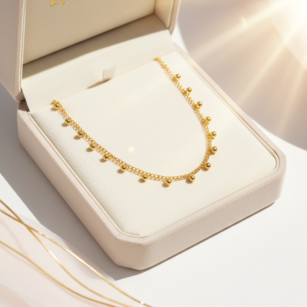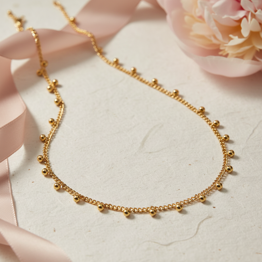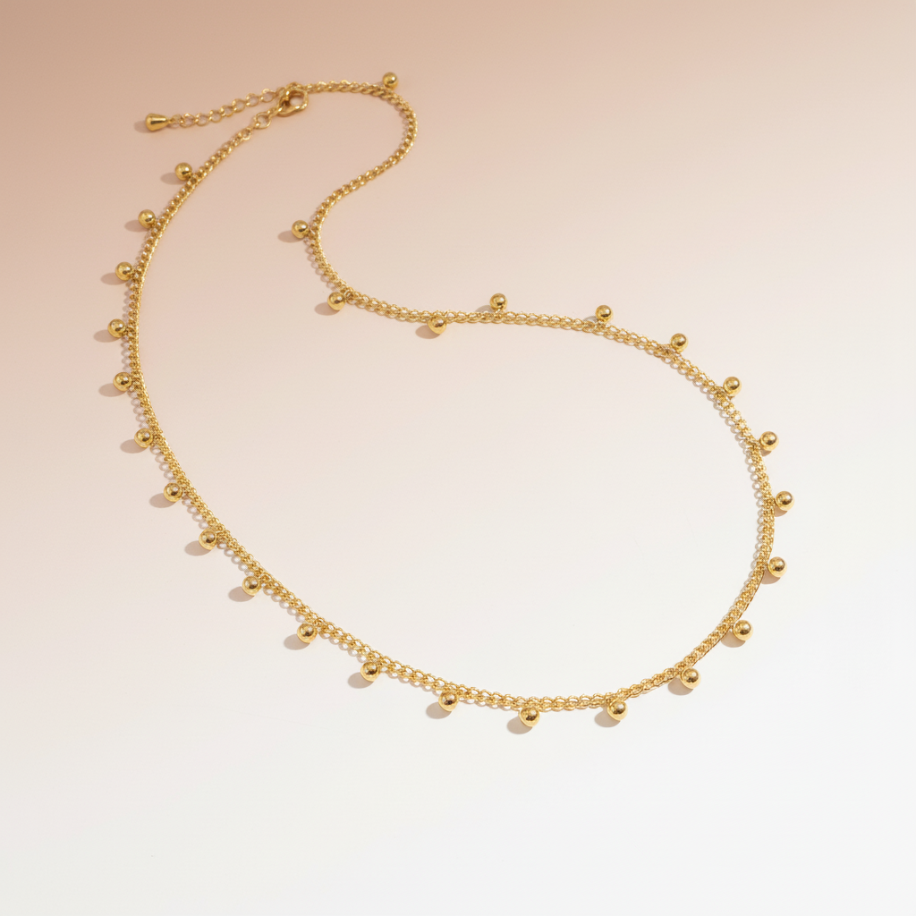 Minimalist necklace featuring tiny polished beads that shimmer with understated charm. Crafted in 18K gold plated stainless steel, it’s the perfect everyday piece elegant, versatile, and effortlessly chic whether worn solo or layered.