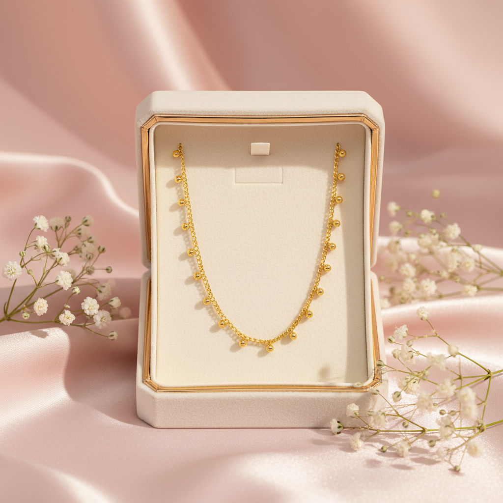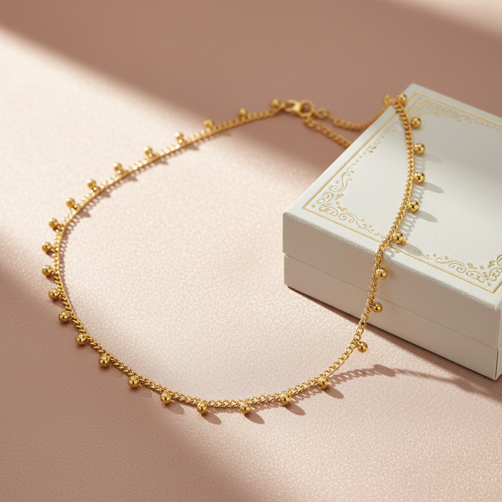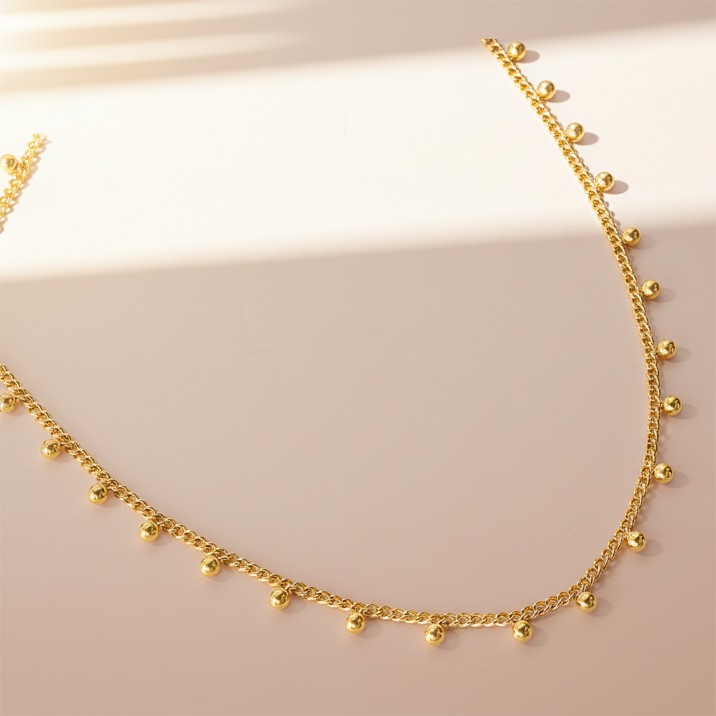 Minimalist necklace featuring tiny polished beads that shimmer with understated charm. Crafted in 18K gold plated stainless steel, it’s the perfect everyday piece elegant, versatile, and effortlessly chic whether worn solo or layered.