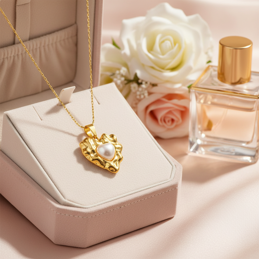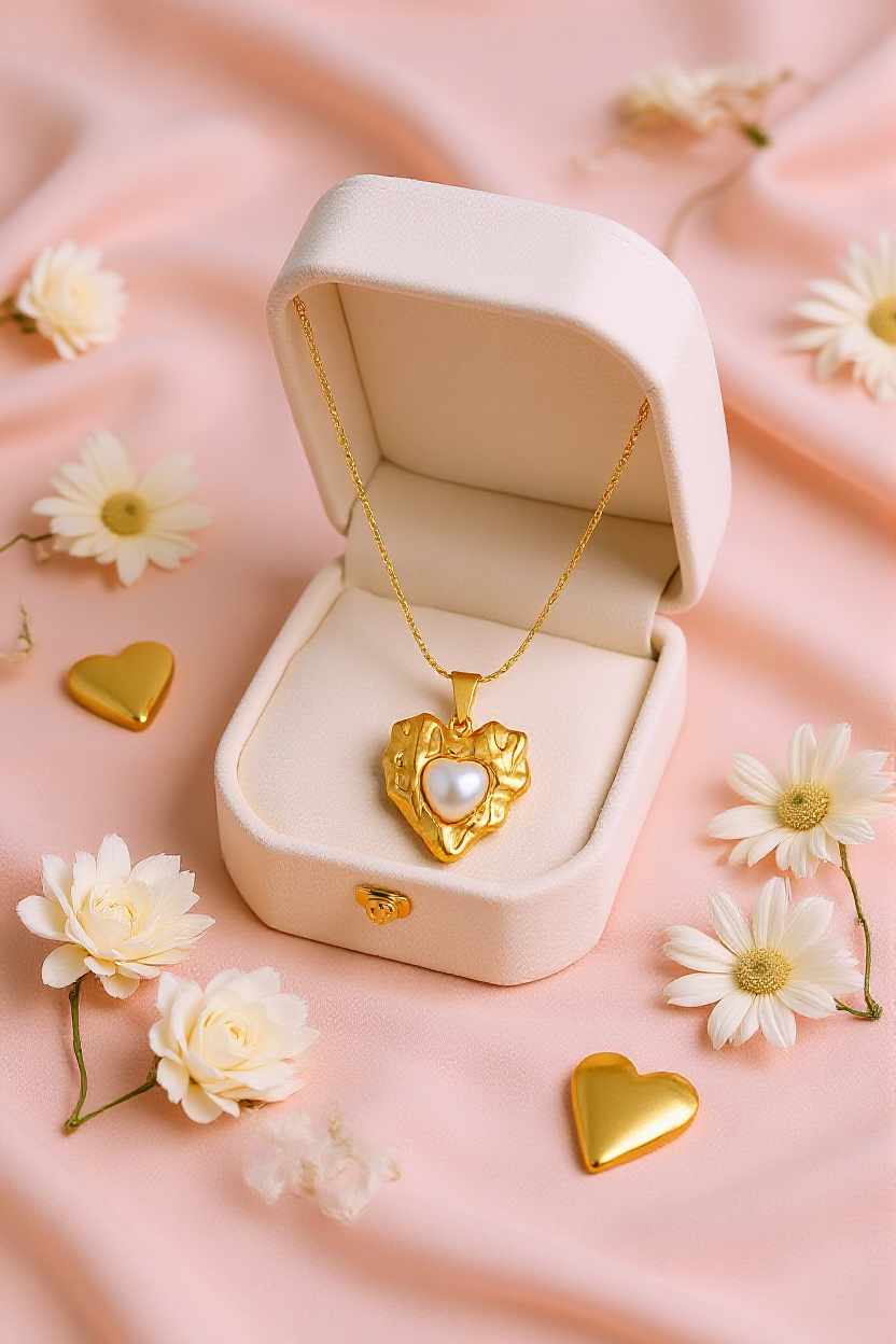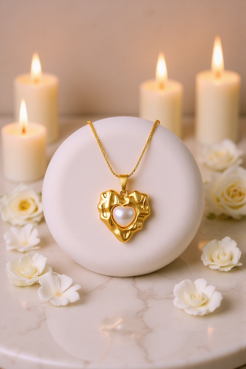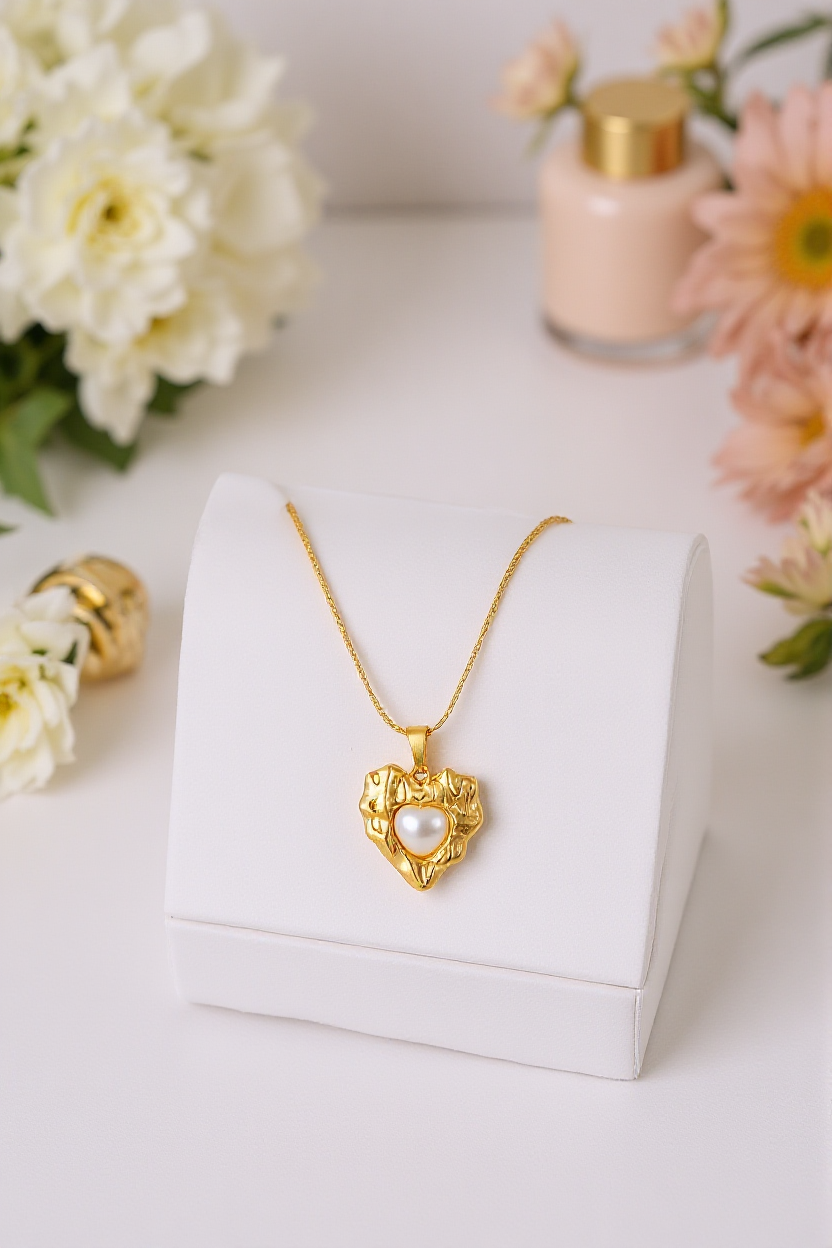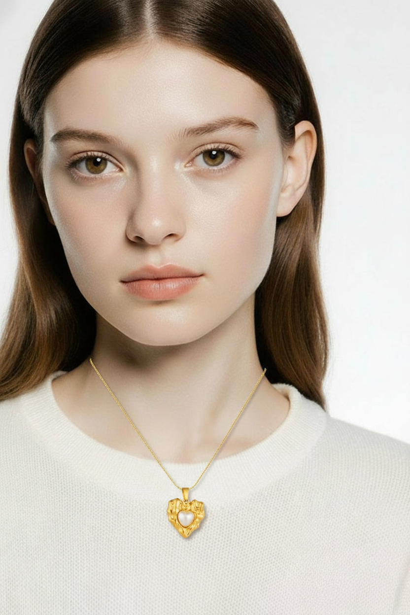 Elegant necklace featuring a sculpted heart pendant with a lustrous pearl accent, crafted in 18K gold plated stainless steel. A symbol of love and timeless beauty, perfect for adding a romantic touch to any outfit.
