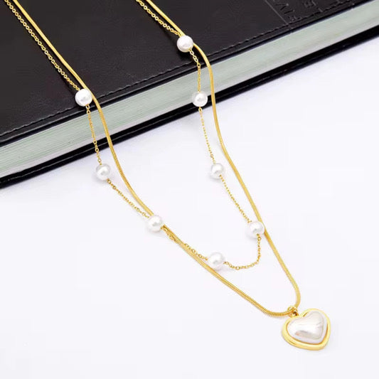 Layered Heart Pearl Necklace – 18K Gold Plated Stainless Steel