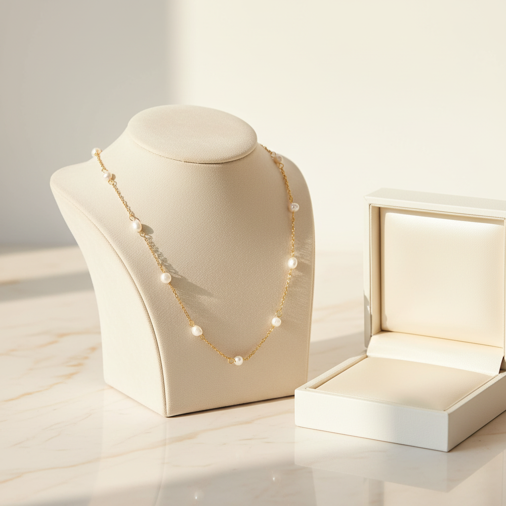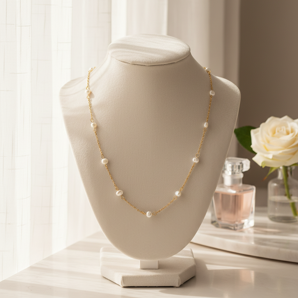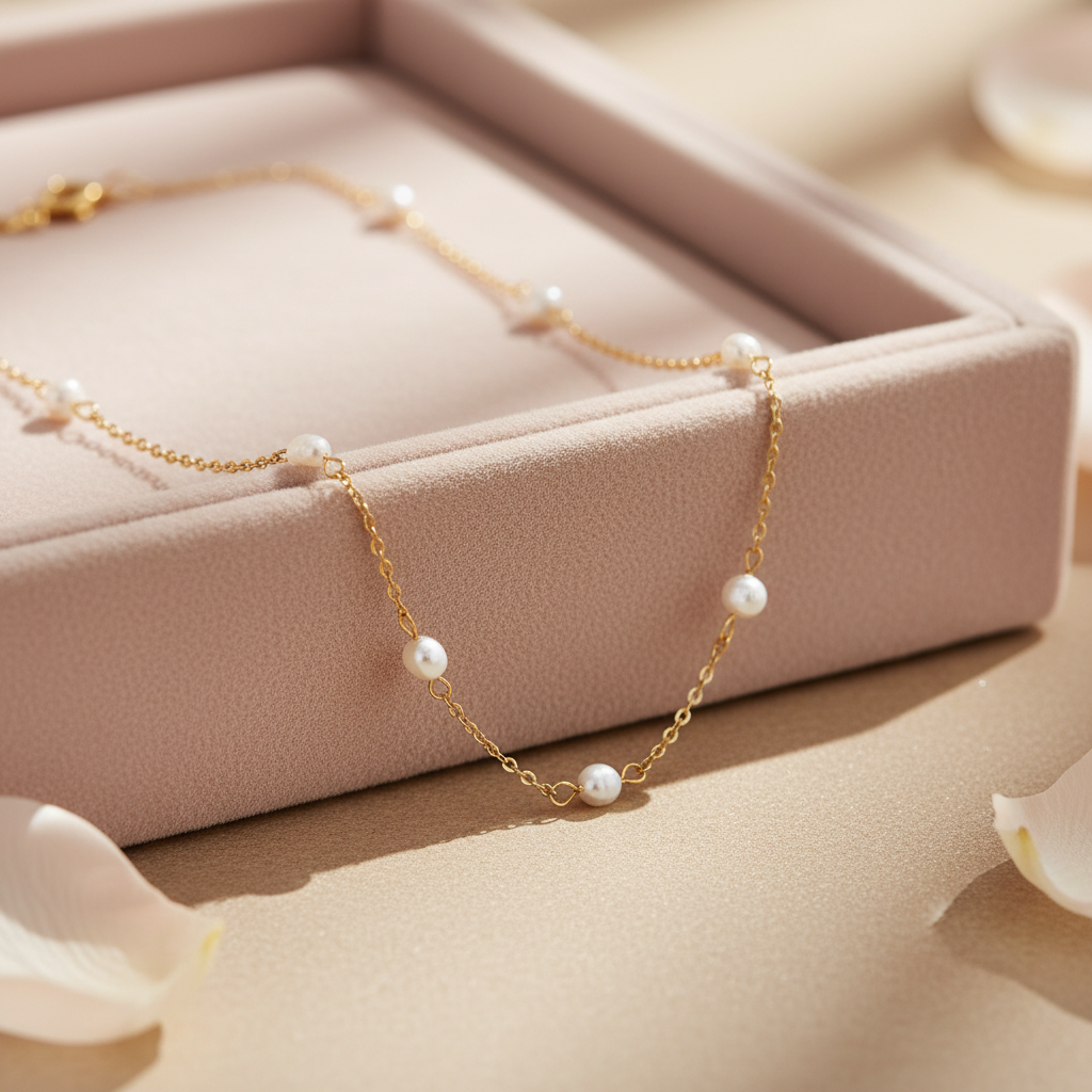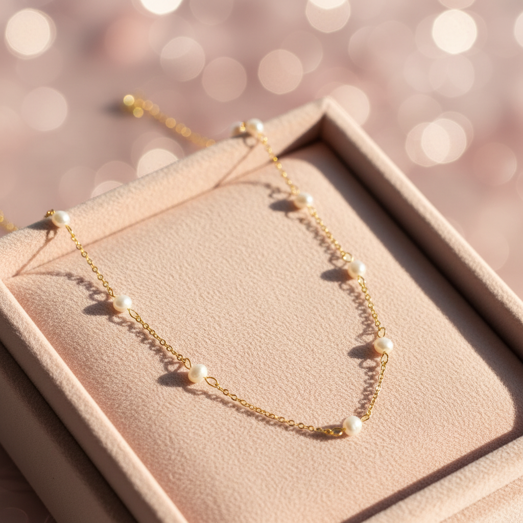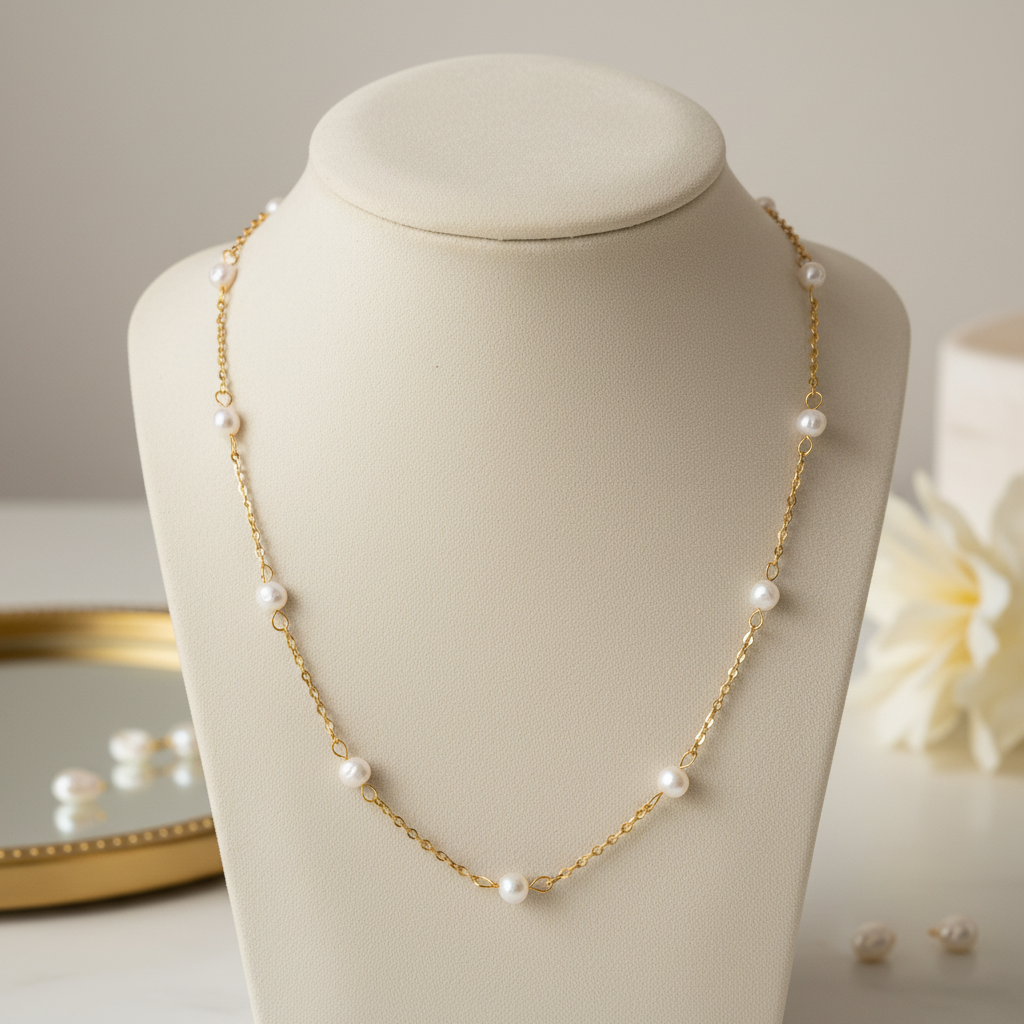 Delicate necklace featuring tiny pearls linked with fine gold-plated chain details. Elegant and versatile, it embodies understated sophistication a perfect blend of modern simplicity and timeless charm.