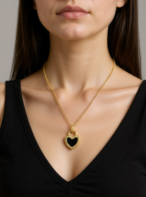 Elegant heart pendant necklace featuring a glossy black enamel center framed in 18K gold-plated stainless steel 316L. A timeless piece that represents strength, love, and sophistication—perfect for elevating any outfit.